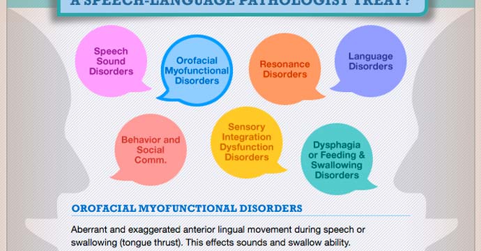 Speech-language pathologists assess and treat individuals throughout their lifespan with speech disorders, language disorders, cognitive-communication disorders, and swallowing disorders. This infographic is a part of the Speech Pathology module in MATCH summarizing the diagnoses normally treated by a speech-language pathologist.